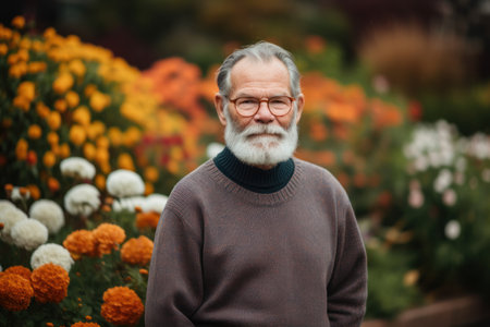 Portrait of a senior man with gray beard and glasses in the autumn garden