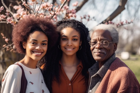 A dark-skinned grandfather and two young girls, a millennial daughter and granddaughter in the garden in the spring on a sunny day, are happy to hug together and look into the camera. Generative AI.