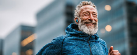 Elderly man in blue hoodie is jogging outdoors, smiling with joy, surrounded by modern architecture and a cloudy atmosphere, embodying fitness and vitality