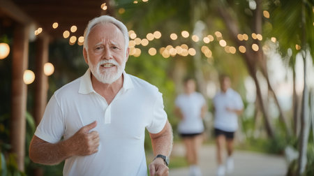An active senior man smiles while jogging outdoors, with friends blurred in the background, promoting healthy lifestyle and fitness.