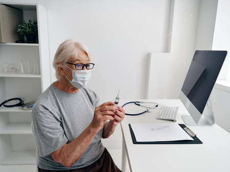 elderly woman patient wearing medical mask vaccine injection passport clinic