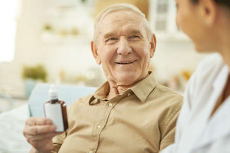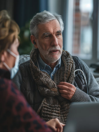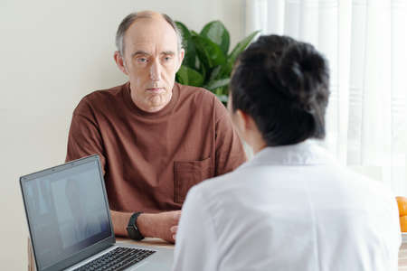 Serious senior man visiting doctor to discuss his complaints and disease symptoms