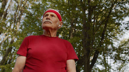 Senior old man runner in city park listening music, enjoying healthy active lifestyle. Elderly male working out cardio morning exercise outdoor
