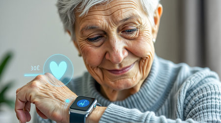 Elder person engaging with smart wearable technology showing health metrics. for healthcare, elderly tech adoption, digital wellness, and aging lifestyle themes.