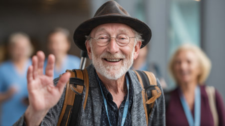 Older man smiles and waves while walking in a busy urban area during the day with an engaging expression