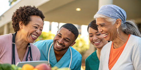Smiling diverse group of adults posing indoors. Warm lighting, natural skin tones, close-up view. Ideal for wellness, beauty, or lifestyle projects.