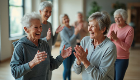 A group of cheerful elderly women, all with silver hair, are clapping and smiling in a bright, spacious room. Their joyful expressions and engaging atmosphere highlight the importance of community and connection in later life.
