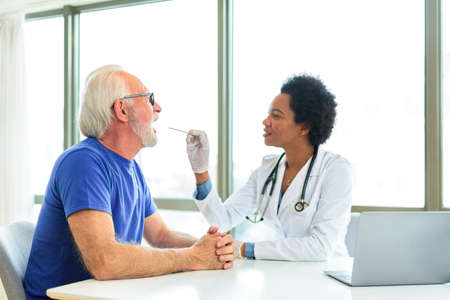 Female african american doctor using inspection spatula to examine older patient throat. Doctor doing throat exam of a older man who open his mouth wide