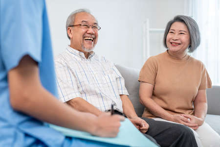 Asian senior old man with bad condition feeling sick sitting on sofa having medical check up by doctor visiting at home. Elder man getting medicine from doctor and receiving health care advisory.