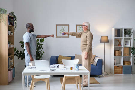 Elderly man exercising with dumbbells and repeating the movement after doctor during his visit at hospital