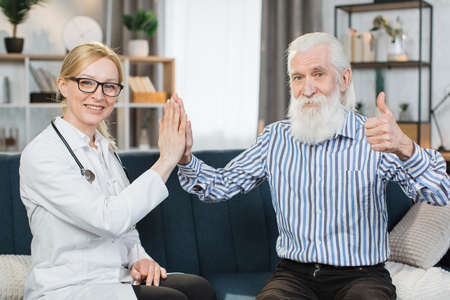 Handsome bearded senior man, showing thumb up to camera, satisfied after successful conversation and giving high five to his family gp doctor, visiting him at home.
