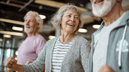 A senior couple participates in guided mobility exercises with a trainer at a community health center. They display positive expressions in a bright and welcoming space.