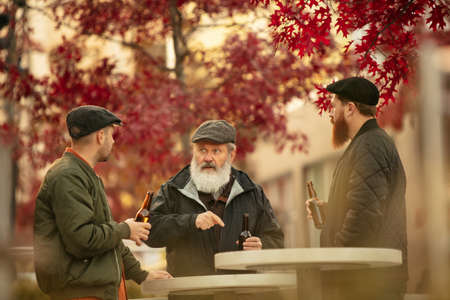 Group of male friends spending time together outdoors on warm autumn day. Drinking lager beer