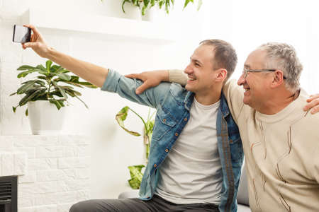 Happy moment. Cheerful young man taking a selfie with his upbeat elderly father waving at the camera and smiling pleasantly