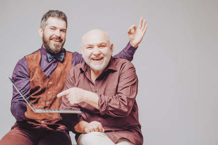Elderly Senior man and bearded son - two generation concept. Man in different ages. Elderly pensioner and hipster son. Aged father. Family tradition.