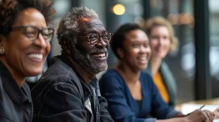 A diverse group of professionals engaged in a collaborative meeting at a modern workspace, smiling and sharing ideas during the afternoon