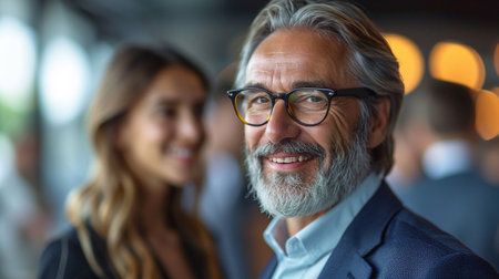Mature man with gray hair and glasses smiling confidently, wearing a blue jacket, standing in a modern indoor space with a supportive colleague in the frame.