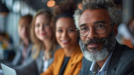 Smiling Man With Gray Beard and Glasses at a Business Meeting