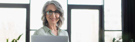Mature businesswoman smiling at camera near laptop in office, banner