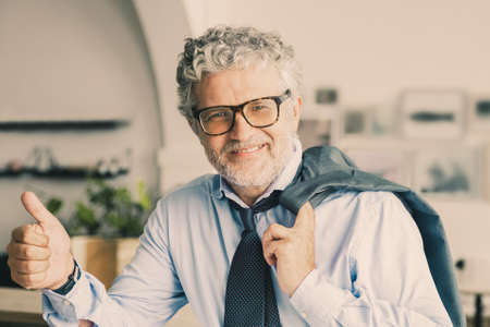 Happy mature business man standing in office cafe, leaning on counter, holding jacket over shoulder, showing thumb up or like. Medium shot. Approval or success concept