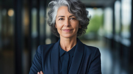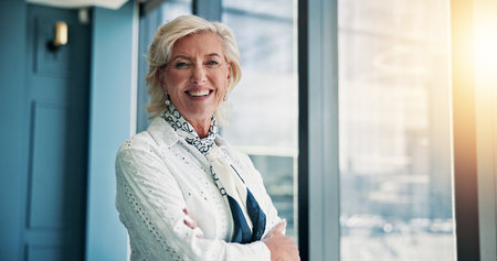 Successful mature senior business woman looking at camera with pride and smile on face
