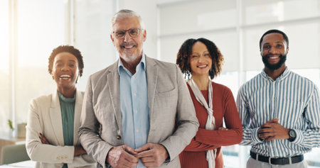 Man, leadership and group in office, ambitious and pride for business growth, teamwork and portrait. Corporate, people or confident for collaboration, partnership or employees in company and together