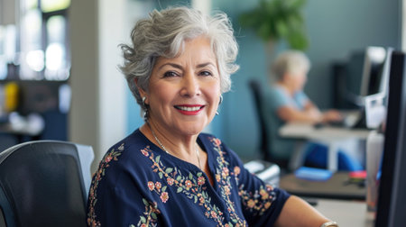 Smiling Senior Woman Working at Computer in Modern Office