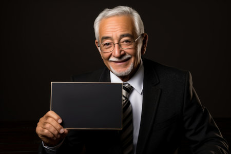 A senior man of European appearance in a business suit is holding a sign or paper. Gray-haired old man. copyspace. pension reform. happy old age and retirement. accumulative pension system