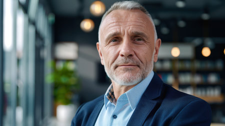 This image captures a confident mature businessman in a bright modern office, showcasing his leadership and professionalism in a contemporary work environment.