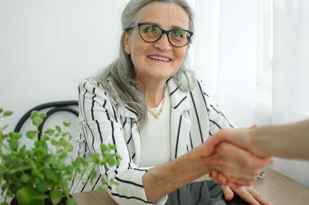 Mature businesswoman is leading an interview with new colleague and shaking their hand at the end. Business people concept