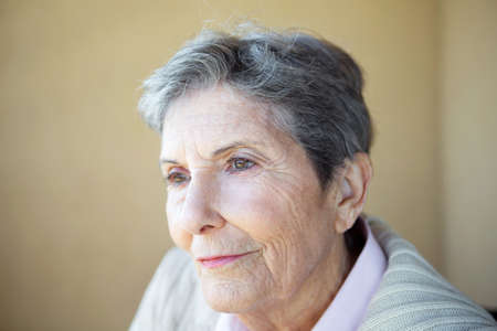 Mature woman smiling in the backyard house with sun and plants. White gray-haired woman at home.
