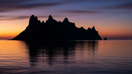 Jagged rock formations are silhouetted against a colorful sunset sky, reflected in the calm sea.