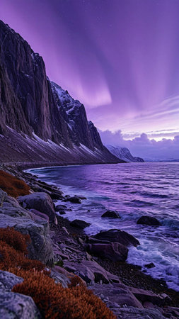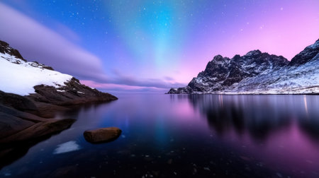 An image captures a vibrant display of the Aurora Borealis illuminating a mountainous landscape. The scene showcases dynamic streaks of pink and purple light against a dark sky. The foreground reveals tranquil water reflecting the celestial light. This image could be used for various projects including environmental or travel-related purposes.