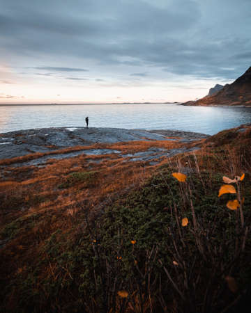 a man is far away, standing with his back against the backdrop of the huge mountains in Lofoten.