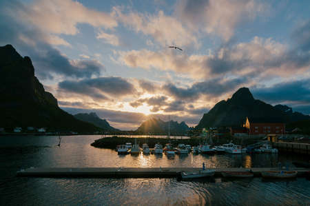 Evening sunset on the harbor of the fishing village of Reine, Moskenes, Lofoten Islands, Norway, Europe