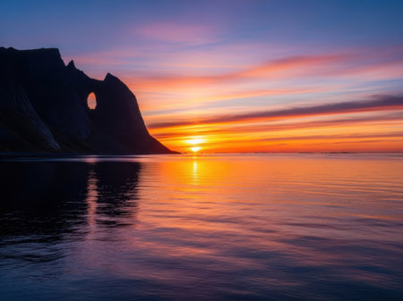 Experience the beauty of a vibrant sunset over calm waters, showcasing stunning colors and reflections on a serene landscape with an island.