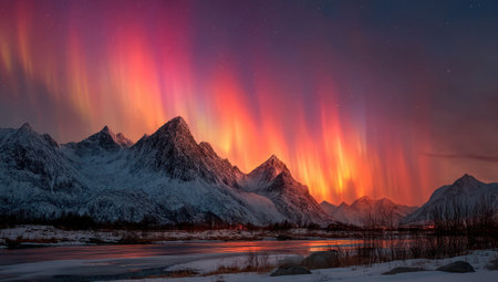 Dramatic display of the aurora borealis is visible above a mountain range. The sky is filled with vibrant colors of pink, red, and orange. The image showcases a landscape with snow-covered mountains and possibly a frozen lake in the foreground, illuminated by the colorful light show. This scene is suitable for use in travel or environmental publications.