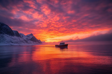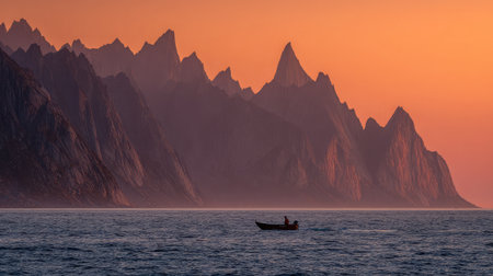 A minimal scene of a small fishing boat under the setting sun, with a silhouette of rugged peaks in the distance