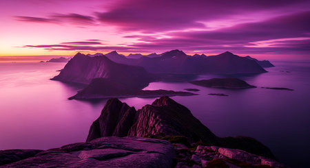 A dramatic landscape featuring jagged purple mountains rising from a calm, reflective body of water. The sky above is a vibrant mix of purple and pink hues, with textured clouds. The scene evokes a sense of remoteness and serene beauty during twilight.