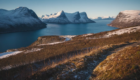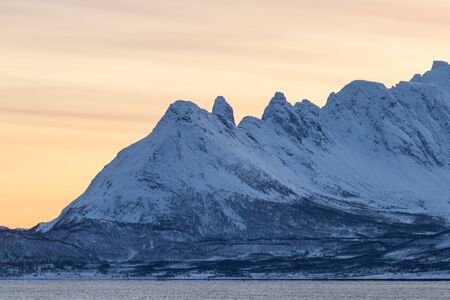 Majestic Norwegian fjord and barren, snow covered mountains during sunset, far above the polar circle near Skjervoy