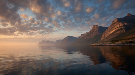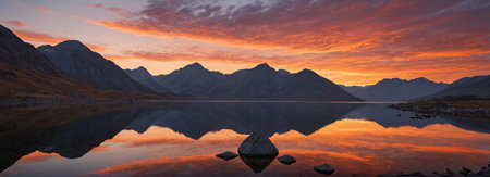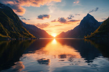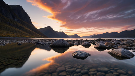 This breathtaking image captures the stunning beauty of mountains during sunset, showcasing reflective waters and dramatic clouds that enhance the serene atmosphere.