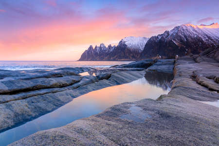 sunset with amazing magenta color over fjord Tromso, Norway. Winter. Polar night. long shutter speed