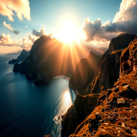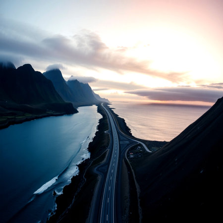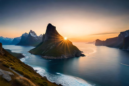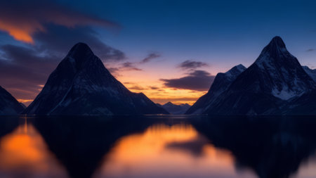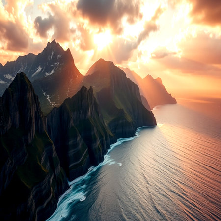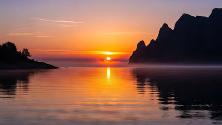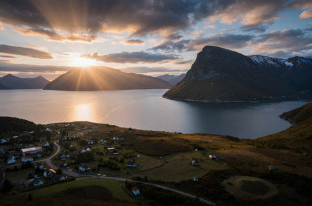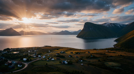 Fjord silhouette, drone's vantage, fading sunlight, coastal charm, detailed and vivid sunset at Norwegian fjords Generative AI