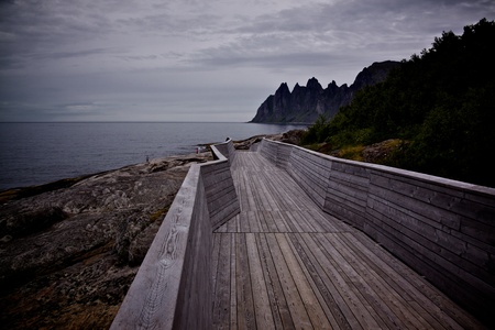 Stunning midnight sun over the Tungeneset (Devil's Teeth) in Senja Island, Norway