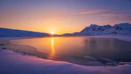Golden light from the rising sun reflects on a tranquil frozen lake, surrounded by white snow and jagged mountain peaks. The peaceful winter scene captures nature's beauty at dawn