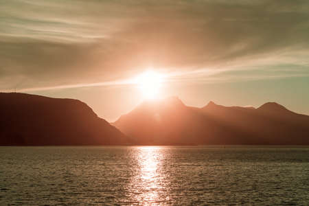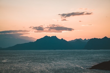 Mountains and sky during sunset. Senja island, Norway. Clouds on the sky during sundown. Nature background.