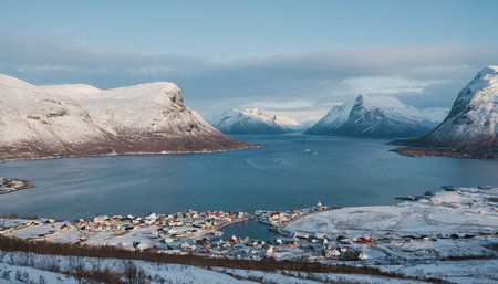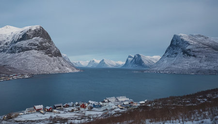 A charming village with colorful houses is nestled by a deep blue winter fjord, framed by snow-covered mountains under a grey sky.