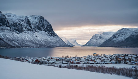 Towering snow-covered mountains overlook a calm fjord leading to a small coastal town bathed in soft, diffused light.