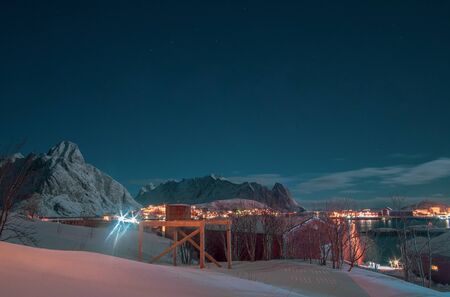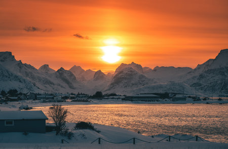 Arctic Winter landscape norwegian sea shore village with snowy covered mountains peaks sunset view Lofoten islands, Norway