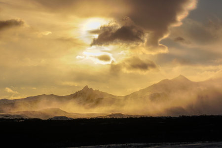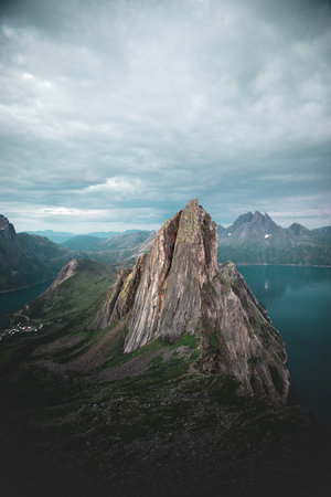 The breathtaking scenery of the mountain of Segla under a cloudy sky in a mysterious evening